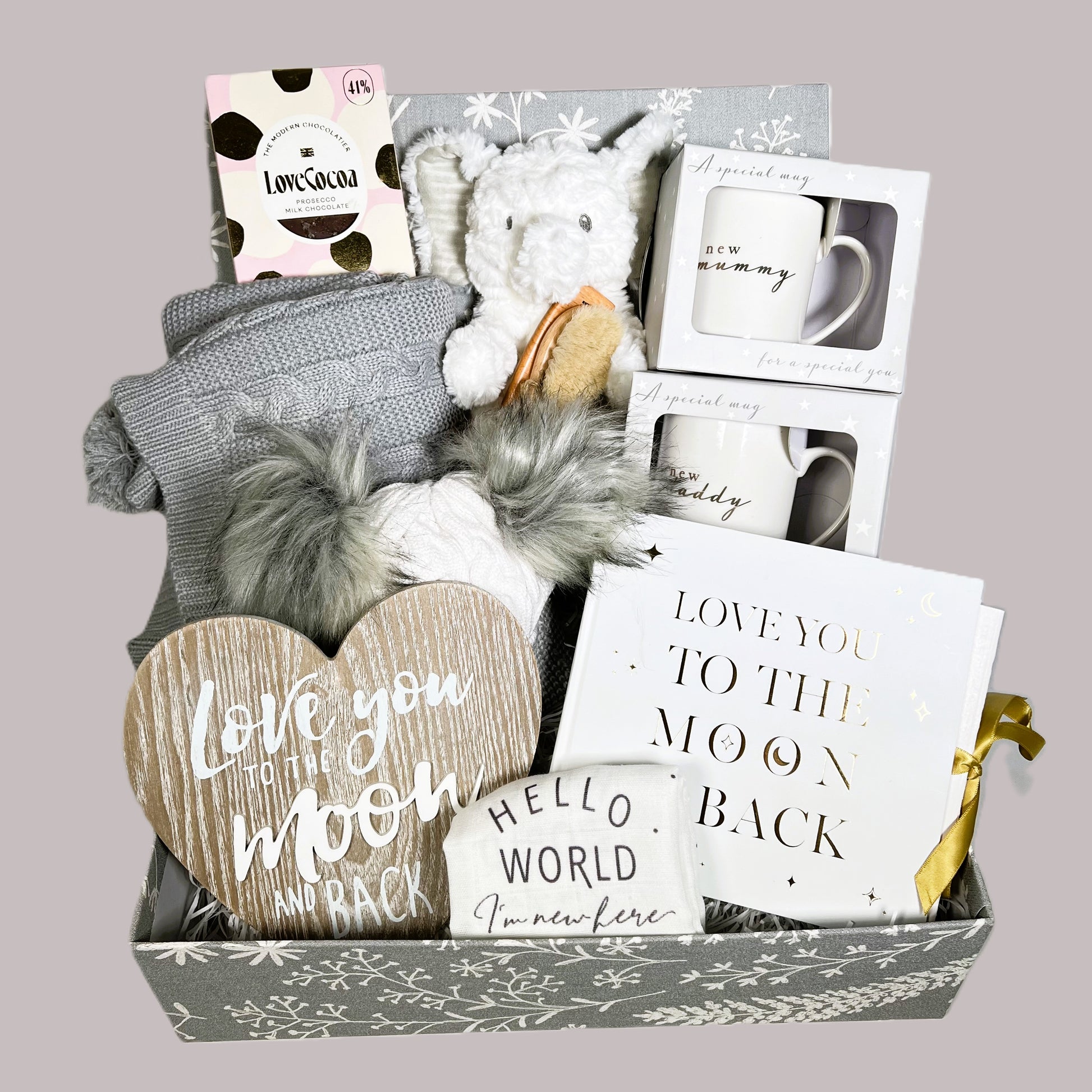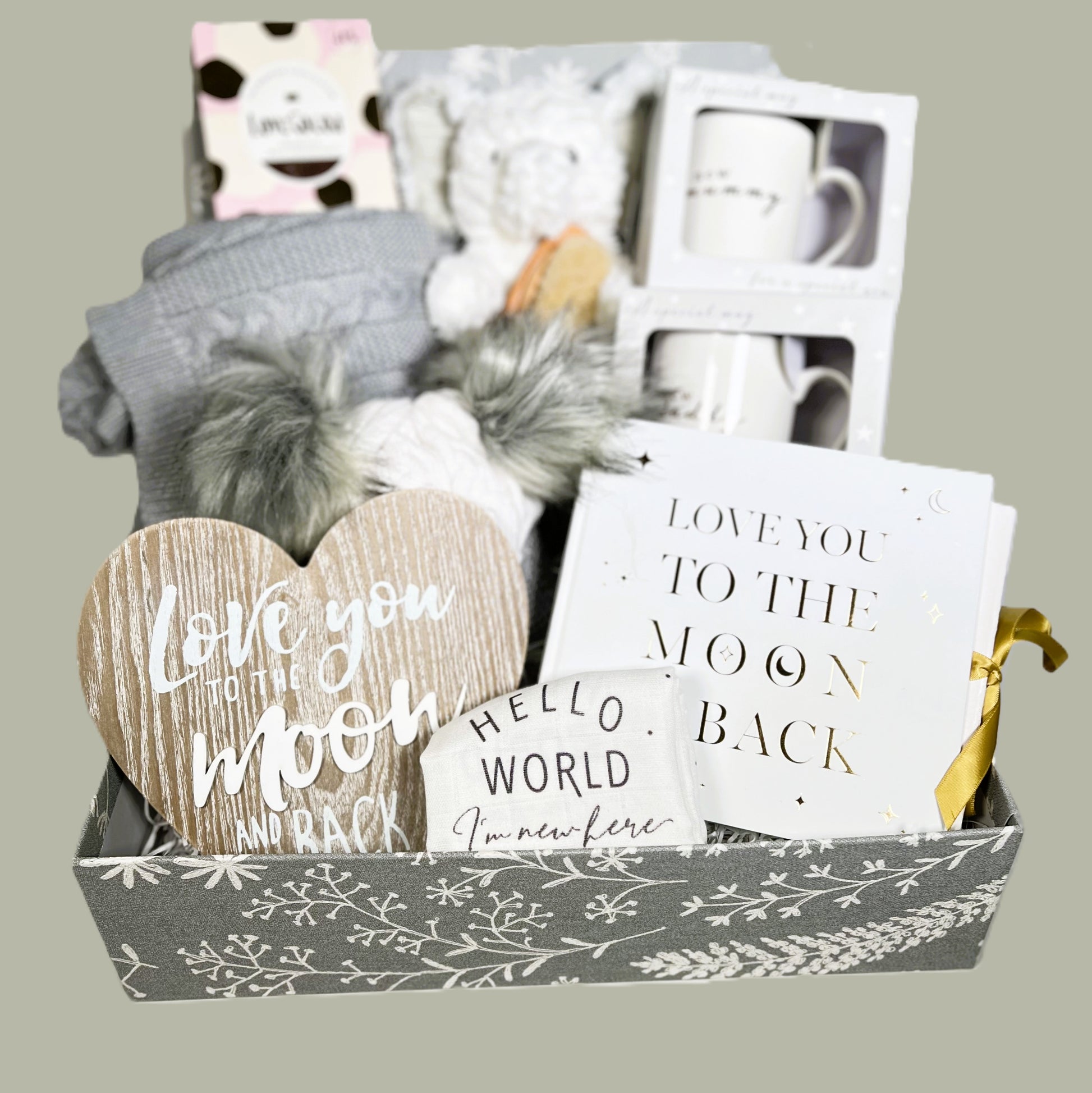 Shopping for special new Mummy gifts? How about our "Love you to the moon and back" unisex new parents hamper? So full of new baby essentials that we had to make an extra big baby keepsake box. We have put in a 1 mummy and 1 new daddy mug but we can easily make that two new mummy or 2 new daddy mugs, just let us know.