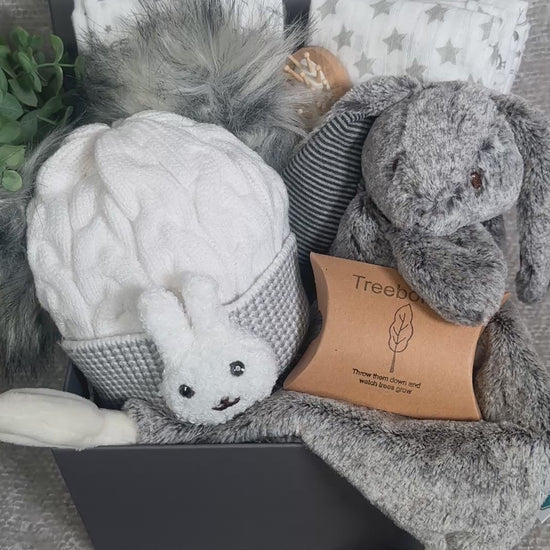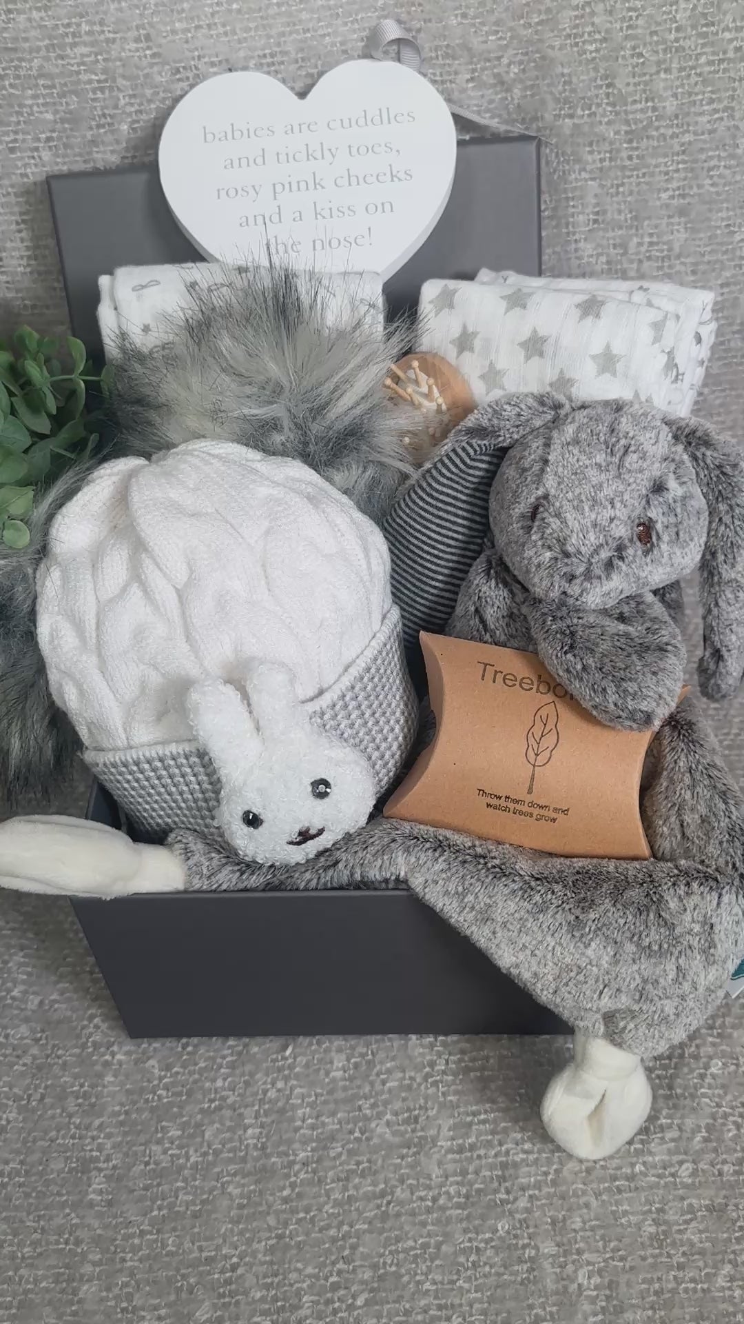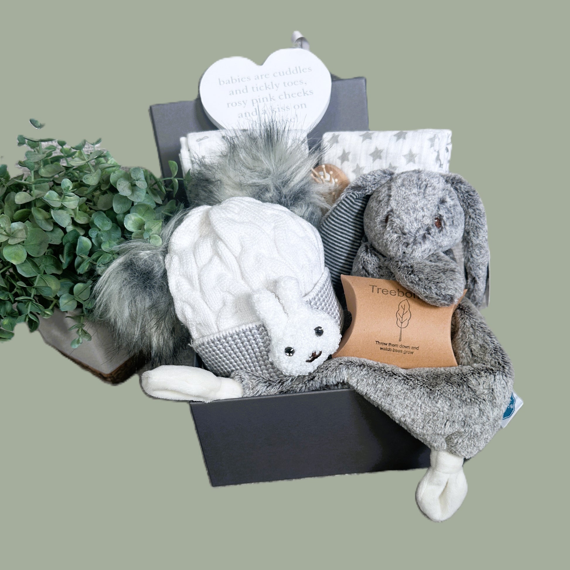 Unisex New Baby Gift "Bunny Cuddles" Baby Essentials Box, Grey And White